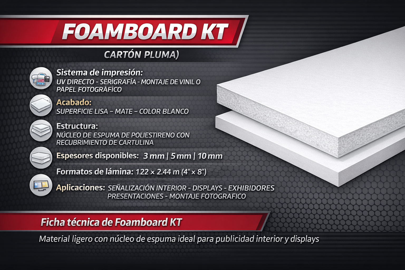 El Foamboard KT es una lámina ligera compuesta por un núcleo de espuma de poliestireno recubierto por dos capas de cartulina blanca. Es uno de los materiales más utilizados en publicidad interior, displays y presentaciones gráficas por su bajo peso y superficie lisa.